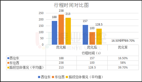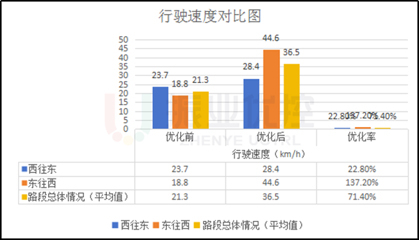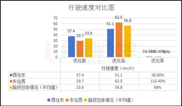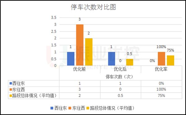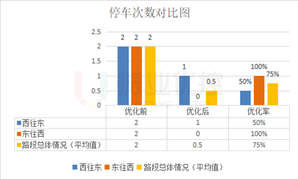西段平均行程时间由213s减少至128.5s,优化率为39.7%;平均行驶速度由21.3km/h提升至36.5km/h,优化率为71.4%;平均停车次数由2次减少至0.5次,优化率为75%。