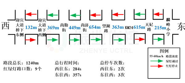 1.沿线多T型路口且间距较近,在无协调控制的情况下,常常出现行驶几个路口连续遭遇红灯的情况,车辆起步时间损耗大,导致路段平均行车速度较低,驾乘者出行体验感差。