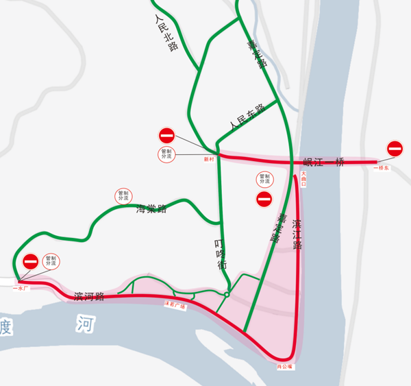 19:00至22:00,在新村路口、岷江一桥东端路口分别设置管制点;20:30至21:30,在滨河路-滨江路一线设置多处管制点。