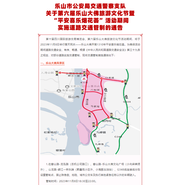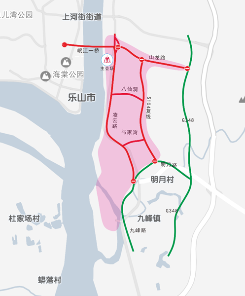 18:30至22:00,在碧山路-龙泓路、碧山路-乐山大佛文化广场、山龙路-岷江一桥东端、G348线连接线路口分别设置管制点。20:30至21:30,在S104复线、明月路、九峰路分别设置管制点。