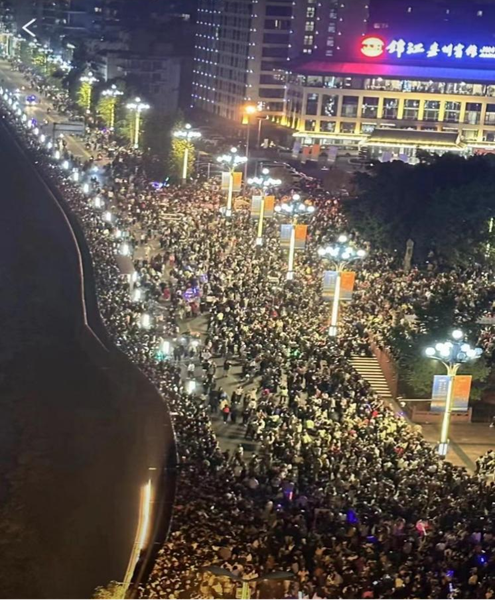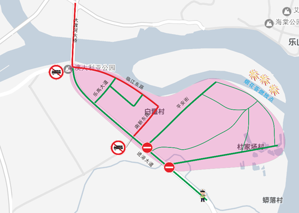 高新区观赏区中杜家场村最靠近烟花表演燃放点,吸引了诸多群众前往。为确保杜家场村附近道路通畅,19:00至21:30,在进港大道-杜家场村路口、平安村路口设置管制点;大渡河大桥、临江东路实施限时禁行,禁止货运车辆通行。