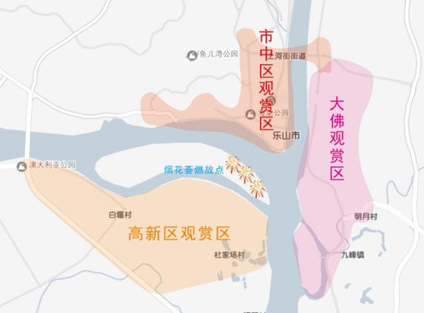 本次活动观赏区分为大佛景区、市中区与高新区,活动前后,三个观赏区域的沿江观赏道路进行临时交通管制。