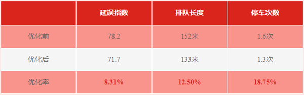 春华路-柏杨东路、 春华路-竹公溪街两个路口的延误指数、排队长度和停车次数均有不同程度的下降。