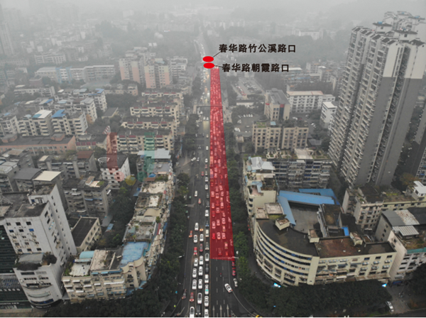 高峰时段,对相邻的北边春华路-柏杨东路路口、南边春华路-竹公溪路口的信控方案进行同步调整,加快节点春华路-朝霞路路口车流疏散。