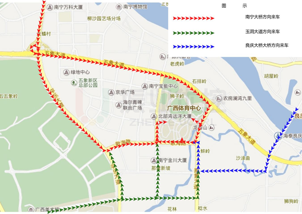 开幕式于11月5日晚上20点在广西体育中心举行,技术团队提前下发预案,增加五象大道东西方向绿灯时间、那黄大道南北方向绿灯时间,加快车流进场速度,防止车流反堵上游路口,影响通行秩序。活动结束后,及时调控南宁大桥、青竹立交等沿线信号灯路口,快速疏导离场车辆通过南宁大桥前往快速方向。