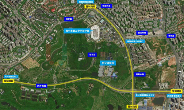 闭幕式于11月15日下午在青秀山风景区壮锦广场举行,14时起对青秀山风景区西门片区实施管控,禁止闭幕式无关车辆由凤岭南路进入。技术团队通过视频监控实时巡查周边绕行路段交通情况,按车流通行需求,增加凤岭南青环路口东进口、青山英华路口北进口的通行时间,确保绕行车流通行顺畅。