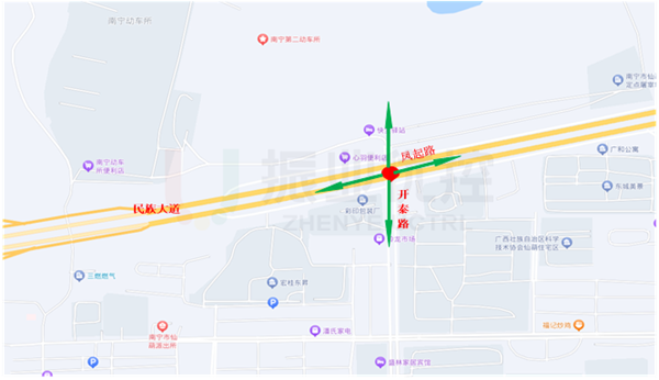- 路口概况:凤起路-开泰路路口位于南宁动车所南侧,周边有小区、商店、工厂等,西边连接民安立交桥。