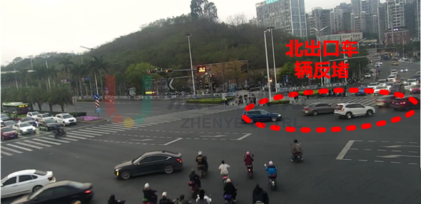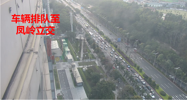 - 问题描述:工作日晚高峰,由西进口左转至凤岭片区方向车流量大,车辆排队接近凤岭立交,拥堵严重。同时,随着路口东北角新建成商场开业,北进口方向出行车流明显增加,但因东右转进城车辆不受信号灯控制,与西左转、北掉头车辆出现明显冲突,加剧路口拥堵。