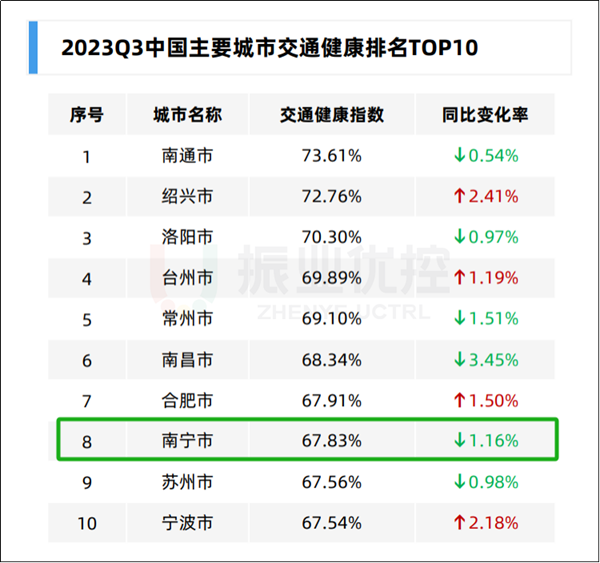 根据互联网平台数据,南宁市入选2023年第三季度中国主要城市交通健康排名TOP10,排名第八,健康指数67.83%,同比2022年第三季度上升一位。
