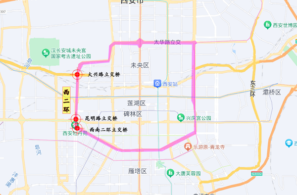 概况:西二环是西安城市快速路骨架路网的重要组成部分,南接南二环西段、北至大兴立交,高架段保持双向4车道通行,地面段保持双向6-8车道,承担着西安城西片区过境和对外交通流转换枢纽功能。