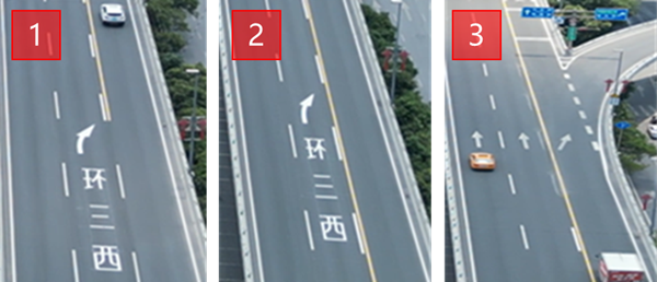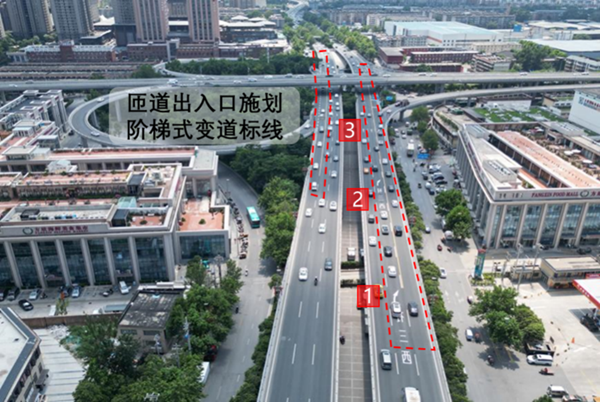 优化措施:应用阶梯式变道交通组织模式。施划地面文字标识、增设车道级指路标志,加强引导需驶离车辆在驶出匝道上游提前变道;施划虚实线,用于驶离车辆向右变道合流;施划长实线,规范匝道口行车秩序,防止车辆随意变道引发交通事故;增设电子抓拍警告设备,对不按规定车道行驶等违法行为进行短信警示教育,让车流由无序变为有序。