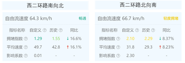 优化效果:新型交通组织模式实施后,西二环主线南向北拥堵指数下降16.6%,平均速度提升16.1%;北向南拥堵指数下降8.37%,平均速度提高8.23%,交通事故率减少3%。