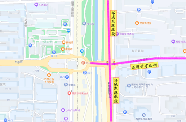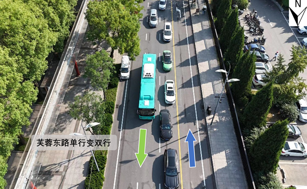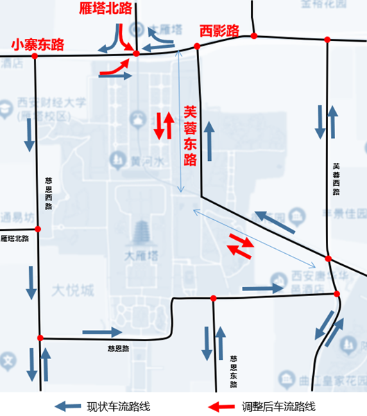 优化措施:芙蓉东路(芙蓉西路至西影路段)由南向北单行调整为双向行驶,拆除大雁塔北广场丁字原封闭护栏,并增设交通信号灯,完善路口转向功能。