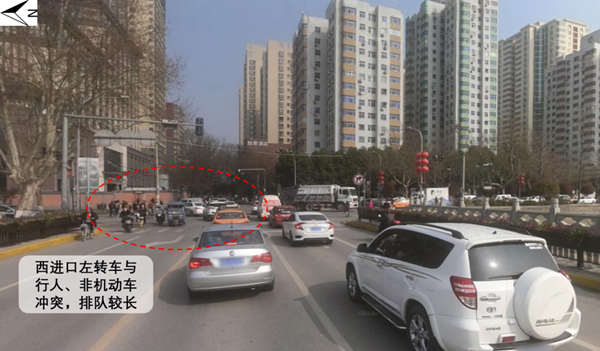 问题简述:东进口双向2车道,左转和直行相位无法分设,东西向左转车辆与行人冲突较大,存在排队溢出现象。