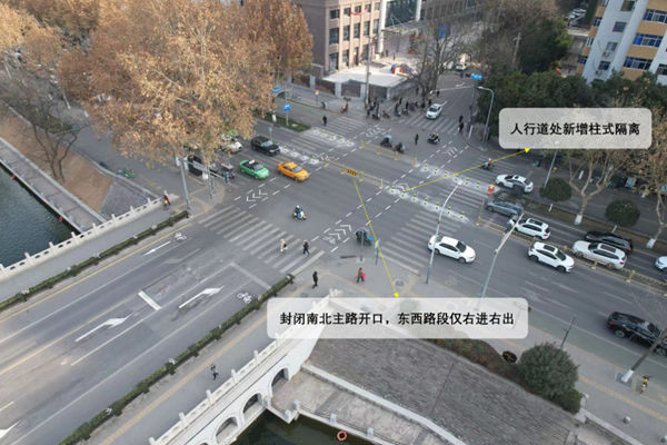 优化措施:采用中央隔离护栏沿南北向封闭路口,东西向实行“右进右出”交通组织,人行横道增设柱式隔离。