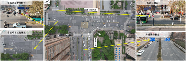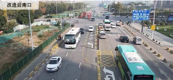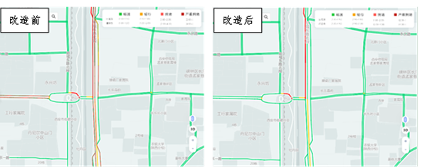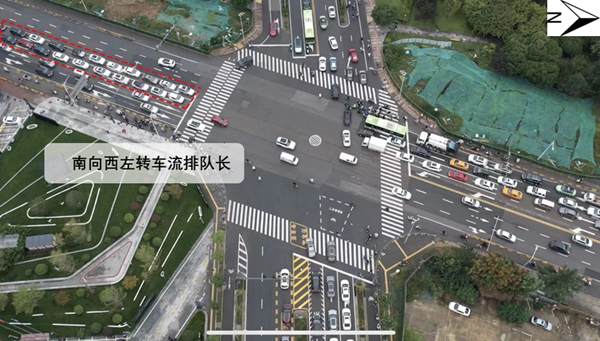 优化措施:南进口道应用“借道左转”交通组织模式,连续设置6级交通标志加强提示引导,调整路口信号放行模式并结合交通流实际持续精细化调优。