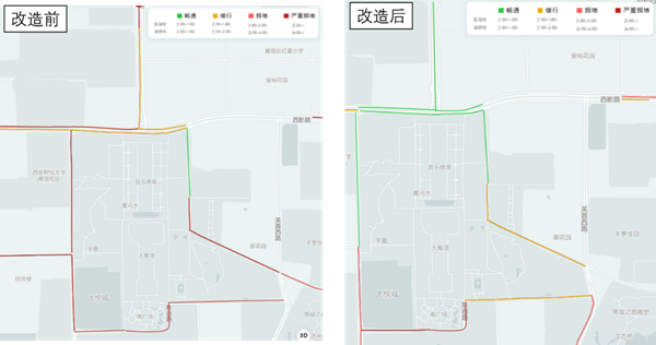 优化效果:借道左转交通组织落地后,高峰时段每个灯时可多通过7-8辆左转机动车,南向西左转车辆排队情况得到大幅度缓解,盘活了西沣路-锦业路片区整体路网通行能力。改造后西沣北路(西沣二路到西沣三路,南向北)工作日早晚高峰拥堵指数下降20.52%。