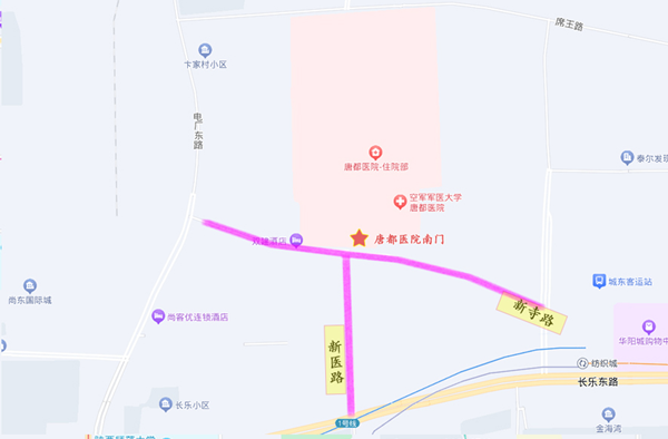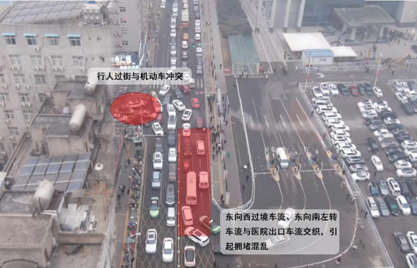 问题简述:医院门前新寺路道路承载能力不足,各类交通流混杂,医院停车场出入口及周边部分公交站点设置不合理,交通流冲突点多,影响就医车流通行效率。