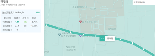 优化效果:通过区域微循环改造,新寺路设置由西向东单行路的措施,唐都医院门前就医高峰期平均拥堵指数下降5.71%,平均运行速度上升7.49%,缓堵效果明显。