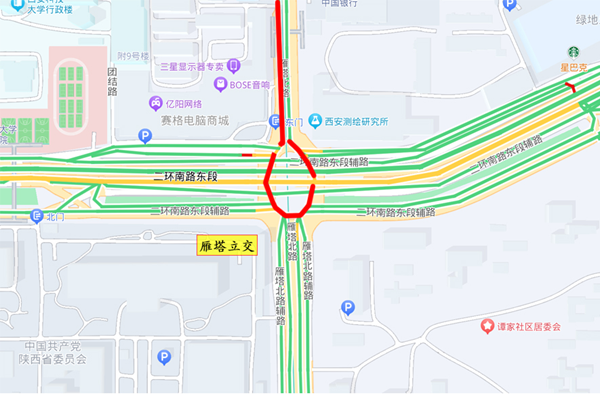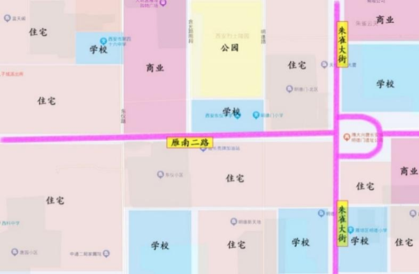 概况:雁南二路为东西向快速路,朱雀大街为南北向主干道,两条道路相交于明德门遗址公园西侧,路口周边写字楼、住宅区、商业体林立,通过性与集散性交通流叠加。
