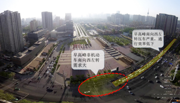 问题简述:工作日早晚高峰路口南向西左转车流通行需求极大,排队溢出至上游路口问题频发。