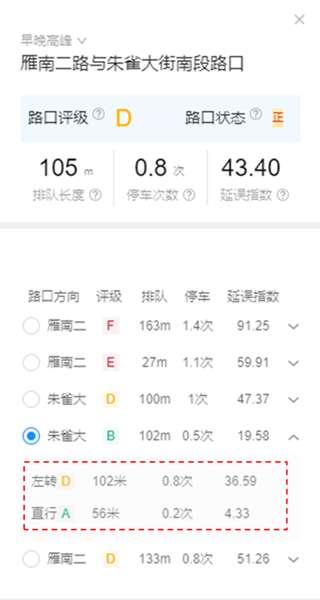 优化效果:优化后路口整体排队长度由105米缩短至90米(降幅14.28%),平均延误指数下降8.73%。其中南向西左转方向优化效果最为明显,健康评级由等级D提升到B级,排队长度由102米下降至73米(降幅28.43%),平均延误指数下降45.50%。