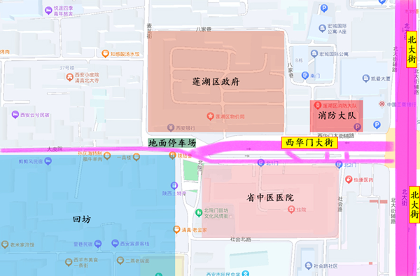 概况:西华门大街(北大街至麦苋街段)道路南侧为陕西省中医医院,北侧为莲湖区人民政府、莲湖区消防大队,西侧为回坊美食文化街区。