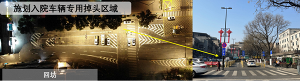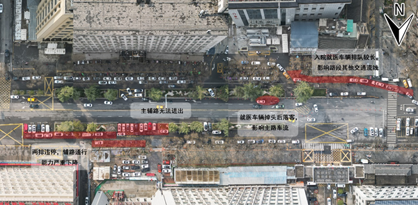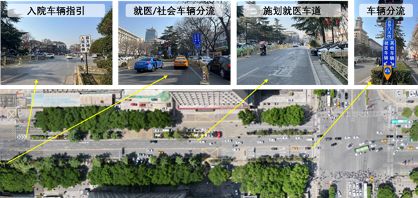 优化措施:通过增设多组交通标志、施划地面文字标识分离就医入院车流、送客临停车流、应急通行车流与其他车流,将原有路内停车位调整为应急处置区域,旅游高峰期作为公安值守点。