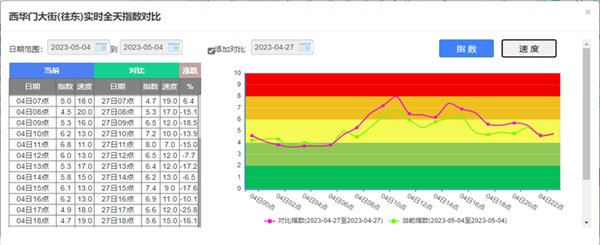 优化效果:经过综合施策,高峰时段西华门大街(北大街-麦苋街段)交通秩序明显改善。由西向东方向早高峰拥堵指数从5.3变为4.5,下降了15.1%,平均速度由17.0km/h变为20.0km/h,上升了17.6%;晚高峰交通指数从6.6变为4.9,下降了25.8%,平均速度由12.0km/h变为18.0km/h,上升了50.0%。