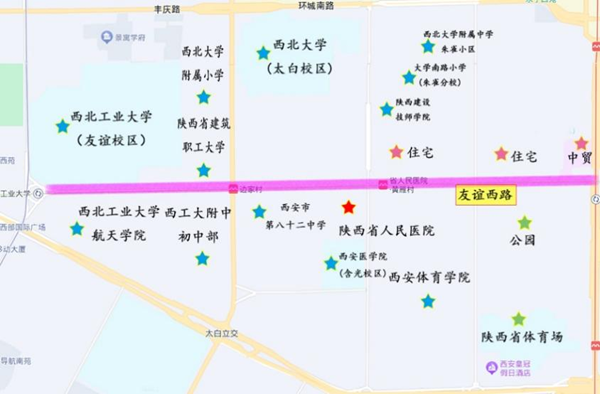 概况:友谊西路是西安市碑林区重要通勤道路之一,为三块板道路,全线分布有西安市第八十二中学、西北工业大学附属中学、西北工业大学、陕西省人民医院等多所“医校”,早晚高峰公众出行密集。