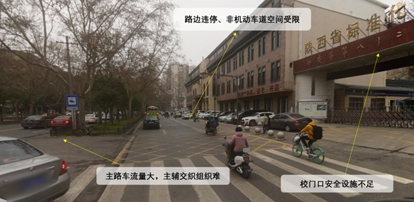 概况:陕西师范大学凤凰城小学门前元朔大道为四块板双向六车道道路,上下学时段学生过街较为集中。
