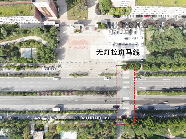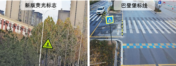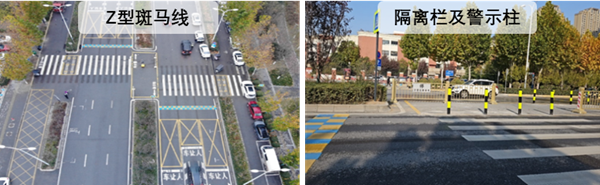 优化措施:设置“Z”字型斑马线及“阶梯式”停止线保障人、车安全视距,施划“巴登堡纹”标线增强斑马线警示效果,增设荧光黄绿新型交通标志及警示柱提升夜间视认性。